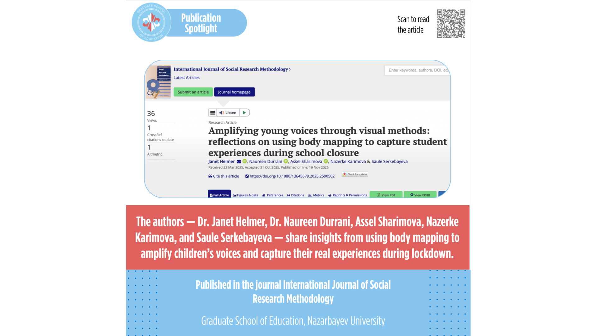Жақында International Journal of Social Research Methodology журналында жарияланған мақалада авторлар – Джанет Хелмер, Наурин Дуррани, Асель Шаримова, Назерке Каримова және Сауле Серкебаева – балаларға локдаун кезеңіндегі тәжірибелерімен бөлісуге көмектесу, олардың алаңдаушылығын айқындау үшін «боди-мэппинг» (body mapping) әдісін қолданудың нәтижелерімен бөліседі.